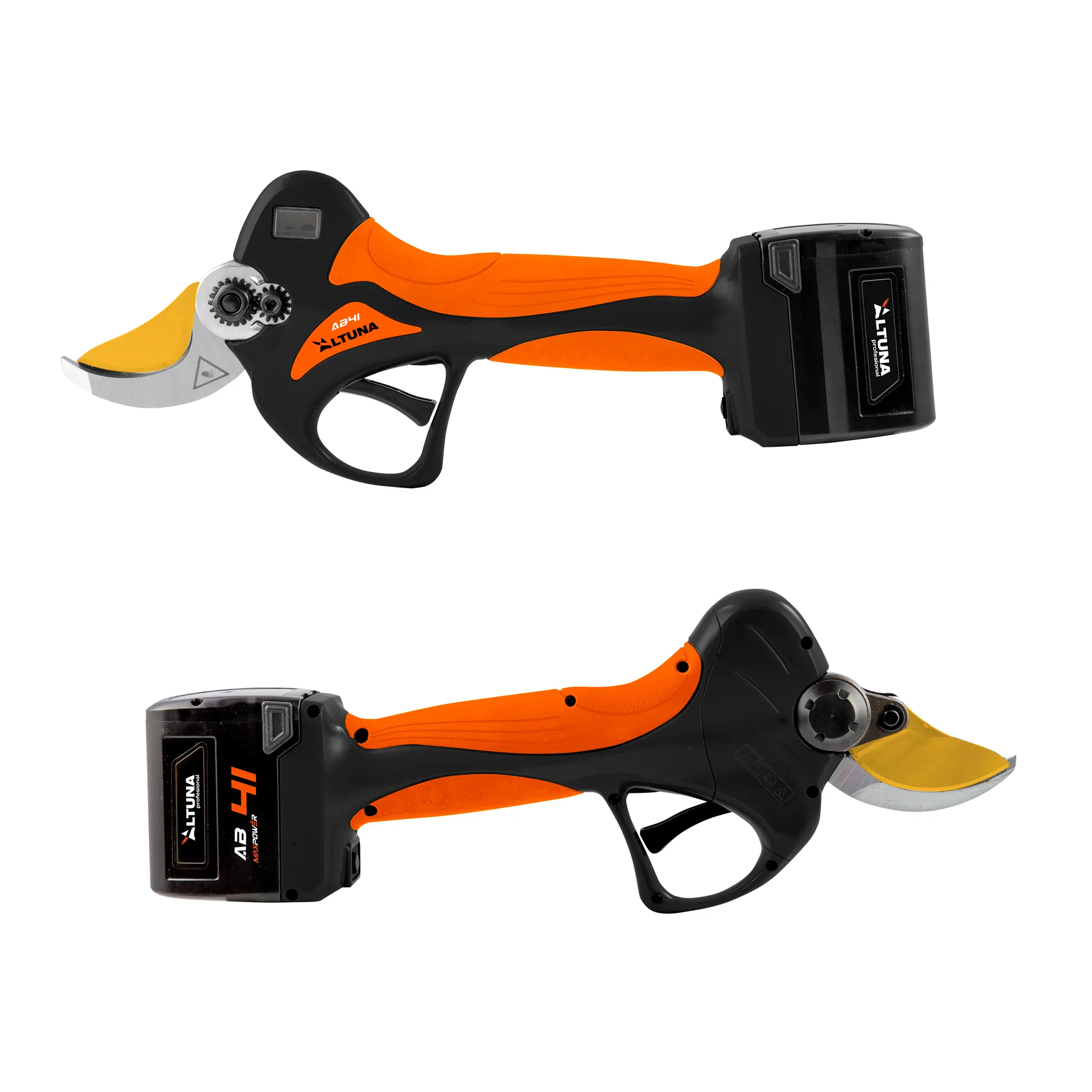 Tijera de batería ALTUNA AB41 con doble apertura de 32 y 41 mm, cuchilla de titanio y motor brushless de 500W. Corte progresivo, sistema FastCutting y 3 baterías de 25,2V – 2,5Ah. Máxima potencia para poda profesional intensiva.